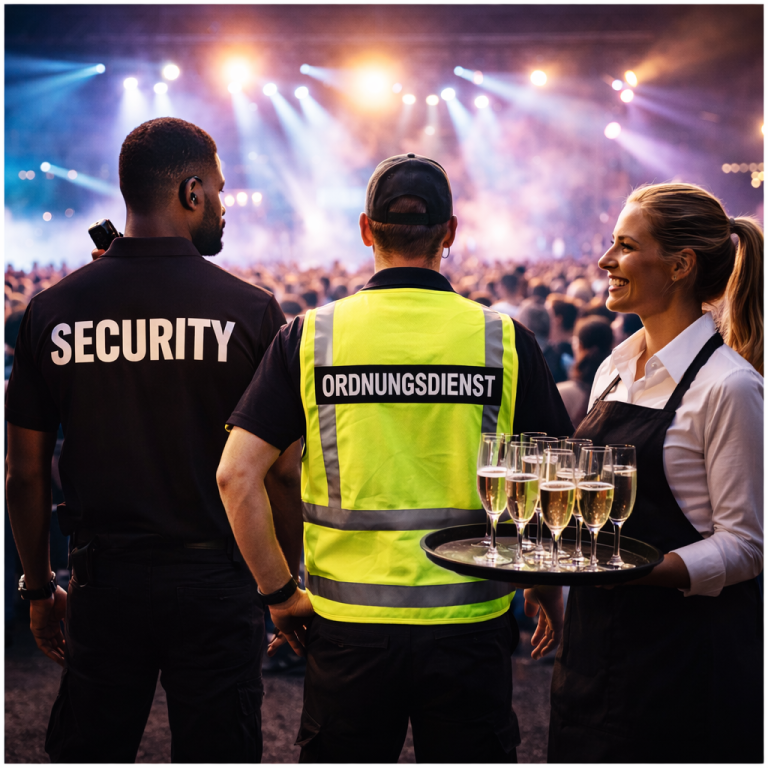 Neben Planung, Booking und Technik stellen wir auch qualifiziertes Personal für Veranstaltungen bereit. Dazu gehören Security, Ordnungsdienst und Gastronomie-Teams, die für einen sicheren, reibungslosen und professionellen Ablauf sorgen – vom Einlass bis zum letzten Gast.